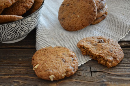 Veškeré sypké suroviny vsypeme do mísy, přidáme vejce, rozpuštěné máslo a vše dobře promícháme. Nakonec vmícháme na kousky nasekané mandle a hořkou čokoládu.