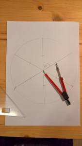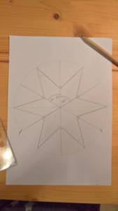 7. Ze středu si narýsujte libovolně malou kružnici (Jak dlouhé budou cípy hvězdy) a sestrojte hvězdu viz. obrázek. (Nebo jakkoliv jinak si nakreslete hvězdu :))