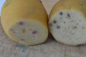Ochucené sýry nacpěte do připravených silonek. Pořádně utlačte, co nejvíce to jde. Pevně zavažte, až těsně nad sýrem. Nechejte dost dlouhý provázek, za který se budou válce věšet do udírny.