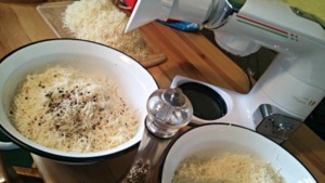 Když sýr nastrouháte, rychleji se rozpustí a lépe se dochutí. Strouhat větší množství sýra je otrava. Doporučujeme proto nažhavit robota, nasadit nástavce a nastrouhat. Stačí nahrubo. Jak vidíte na fotce. My jsme použili značku ETA Gratus MAXIPASTA.