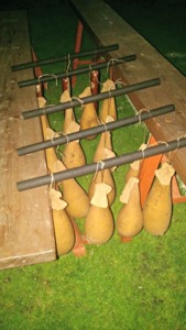 Jak vidíte na fotce, sýr zavěste do udírny. Teplota by v této chvíli měla být okolo 60 °C. Při této teplotě nechejte sýr v udírně asi 2 hodiny. Sýr se pěkně prokouří, získá uzenou chuť. Po této době můžete maličko „přitopit“, na 80 °C a udit další 2 hodiny.