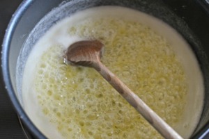 Do jíšky nalijeme po částech studený vývar a průběžně rozmícháváme. Plotnu máme zapnutou na slabší teplotu.