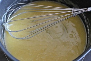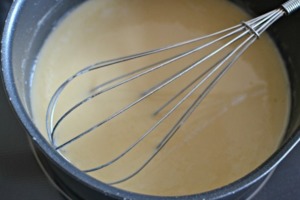 Maličko ztlumíme teplotu a vsypeme do hrnce mouku. Ihned rozmícháme metličkou, aby nevznikly hrudky.