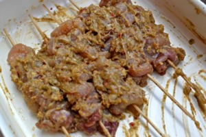 Připravte si všechny suroviny na marinádu. Česnek nasekejte najemno, papričku nasekejte také najemno, stejně tak zázvor. Smíchejte a připravte marinádu na kuřecí maso. To nakrájejte na proužky, které potom budete napichovat na špejli. Pořádně v marinádě promíchejte. Nechejte v lednici do druhého dne.