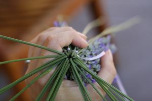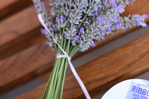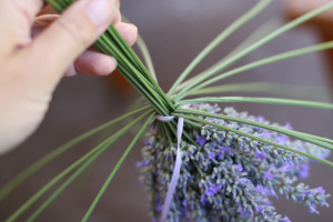 Z levandulových stonků odstraňte zelené lístky. Stuhou svažte všechny levandule pevně, těsně pod fialovými kvítky.