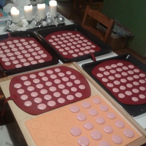 Malé kulaté makronky vytláčíme na plech vyložený pečícím papírem, na který jsme si předem nakreslili tužkou podle malé skleničky kolečka. Ideální a dokonalou pomůckou je silikonová podložka na makronky, kde jsou vyznačeny okraje pro kolečka. Já mám čtyři skvělé silikonové podložky od Tefalu, které jsem si nechala dovézt z Francie, protože u nás je bohužel neseženete. U nás tyto podložky nabízí například Tescoma. Ty od Tefalu mají obrovskou výhodu, protože z jedné strany jsou maličké makronky, z druhé větší. Takže si můžete vybrat.