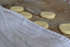 Vykynuté těsto rozválíme na pomoučené ploše na tloušťku asi 1,5 cm. Použijeme nerezovou kulatou formičku a vykrajujeme koblihy, lehce pomoučíme, přikryjeme je čistou utěrkou a necháme ještě 20 minut kynout.