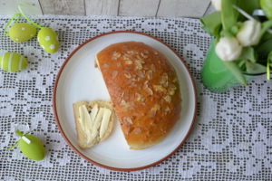 Dejte přípravě mazance dost času, musí v klidu a teple kynout alespoň 45 minut. Nezapomeňte po vykynutí říznou na mazanci kříž. Bude jím ucházet přebytečná pára a mazanec nepraskne.