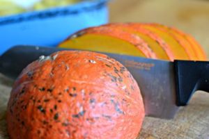 Dýni překrojte napůl, velkou lžící vydlábněte měkkou část se semínky a nakrájejte na větší kostky.