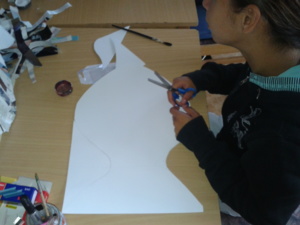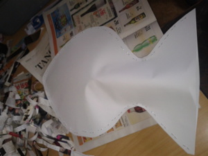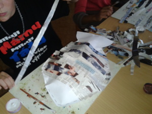 Z novin nastříháme proužky. Ty potřebujeme k dotvarování těla ryby.Proužky papíru začneme lepit na naše vycpané tělo ryby. Cik cak nalepíme alespoň tři vrstvy proužků.