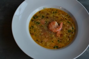 Na talíř rozdělte velké krevety, kusy masa a zalijte polévkou.