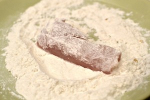 Kuřecí prsa omyjeme, osušíme a nakrájíme na malé plátky, silné asi 1,5 cm. Osolíme a můžeme také lehce opepřit. Kousky obalíme ze všech stran v mouce.