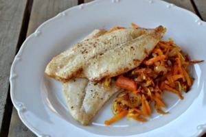 Do výpeku z ryb vsypeme na půlkolečka nakrájenou cibuli a osmahneme do sklovata. Přidáme na velké nudličky nastrouhanou zeleninu, osolíme, opepříme a společně osmahneme doměkka.