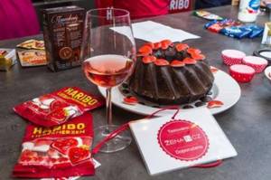 Polevu rozpusťte podle návodu na obalu. Polijte jí celou bábovku a ozdobte srdíčky Haribo. Nechejte vychladnout a polevu zatuhnout.