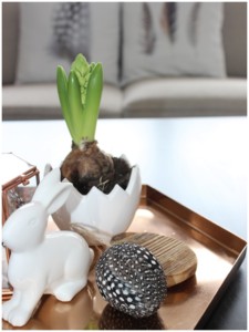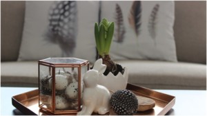 Polštáře - Kik; Tác - H M; Box, peří, peříčkové vajíčko - Nordic day; Květináč - Albert; Zajíček, kropenaté vajíčka - Hornbach