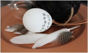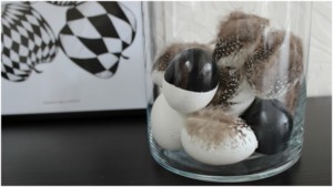 Vajíčko skleněné, bílé s nápisem i černé z peří - Nordic day