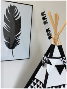 Tenhle obraz za tee-pee obměňuji ráda, vždy tématicky, na Vánoce jsem si zde vytvořila stromeček a na loňské Velikonoce jsem vyrobila zajíčka. Je veliký a zatím jsem nesehnala plakát, který by zde mohl být, ale již po něčem pokukuji :-) Asi jsem psala již x krát jak to dělám, černý motiv je samo lepící tapeta, vždy z rubu načrtnu motiv, vystřihnu a poté nalepím na balící papír z rubu. Tohle jsem měla hotové během patnácti minut...