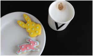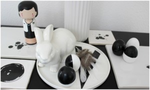Panenka Coco, talíř s písmenem V, kachličky, peří - Nordic day; Zajíček - Hornbach; Váza - Kik