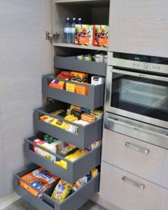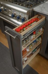 Máte ve spodní části kuchyňské linky úzký prostor, který nevíte na co využít? Nechejte si do něj umístit úzký plnovýsuv na oleje, octy, sirupy. Ideálně poblíž sporáku a dřezu.