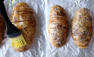 Každou bramboru nakrájejte od začátku do konce na plátky široké 3 - 6 mm. Ale dávejte velký pozor, neprokrojte až do konce, aby plátky držely u sebe.
