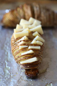 Sýr nakrájejte na malé tenké plátky. Pomocí malého nožíku opatrně rozevírejte jednotlivé plátky brambory a dávejte mezi ně kousky sýra.