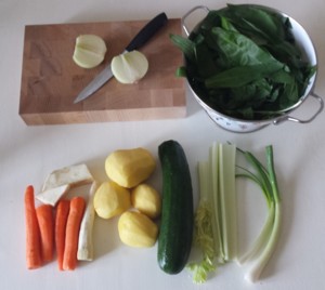 Cibuli nasekáme na jemno. Mrkev, brambory, petržel, celer, cuketu nakrájíme na kostičky.