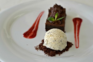 Nemám ráda portské. Zkoušela jsem ho už několikrát a byla jsem si jistá, že z nás kamarádi nikdy nebudou. Mýlila jsem se. Ferreira Porto, které jsme dostali k poslednímu chodu, dezertu, bylo výtečné. Nebylo však lepší než samotný dezert. Opět jasný důkaz toho, že v restauraci Vyhlídka se vaří z prvotřídních surovin. Protože čokoládový řez s pařížským krémem, byl tak čokoládový, že lepší už by to být nemohlo. Jemnou chuť doplnila maková zmrzlina a malinové coulis.