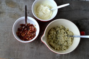 Syrové brambory nastrouháme na nejjemnějším struhadle. Je to děsná piplačka, takže příště je nastrouháme nahrubo a rozmixujeme tyčovým mixérem. Měla by to být co nejhladší kaše. Vodu z brambor slijeme do hrnečku a chvíli necháme stát. Na dně se nám usadí škrob. Z hrníčku potom slijeme vodu a usazený škrob vrátíme do brambor.