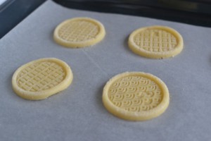 Vykrojené sušenky naskládejte na plech vyložený pečicím papírem a upečte v troubě, vyhřáté na 190 °C, asi 10 až 11 minut. Řiďte se vlastní troubou, sušenky by měly lehce ztmavnout, zezlátnout, ale ne úplně zhnědnout.