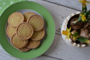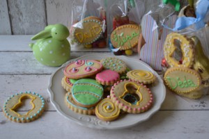 Sušenky můžete vykrojit kovovými nebo plastovými formičkami ve tvaru vajíček, zvířátek, nebo stačí jen obyčejná kolečka. Sušenky s razítkem už nemusíte nijak zdobit, mají na sobě ozdobný reliéf. Ty, které vykrojíte obyčejnou formičkou, můžete ozdobit bílkovým sněhem jako perníčky nebo jinou oblíbenou polevou, třeba čokoládovou.
