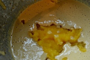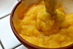 A dýňové pyré, což je vlastně najemno rozmixovaná dýně, kterou jsme předtím uvařili nebo upekli, bez přidání jakýchkoliv dochucovadel.