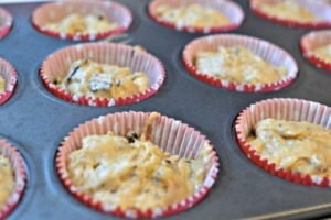 Papírové košíčky si připravíme do formy na muffiny. Plníme těsto do 3/4 výšky košíčku.