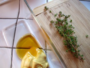 Panenku si omyjeme, osušíme, osolíme a opepříme. Připravíme si snadnou marinádu – smícháme med, hořčici a trochu olivového oleje. Poměr záleží na vaší chuti. Někomu bude chutnat marináda více medová, někdo dá medu jen trošičku a bude si užívat chuti pikantní hořčice. Vše završíme čerstvými tymiánovými lístky.