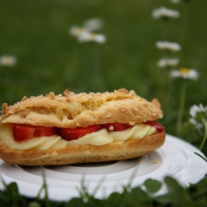 Upečené oválky rozřízneme a plníme krémem a jahodami.