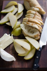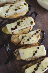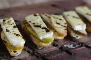 Na každou bagetu dejte plátek hrušky a plátek brie. Posypejte tymiánovými lístky a zakápněte krémovým balzamikem.