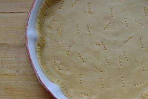 Formu vymažte lehce máslem a přeneste do ní vyválené těsto. Bude nejen na dně, ale musí mít také vysoký okraj, aby vám z něj nevytekla náplň. Těsto na dně propíchejte vidličkou, položte na něj pečící papír a na ten vysypte fazole. To proto, aby se nám těsto nenafouklo.