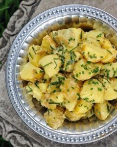 Uvařené brambory nakrájíme na kolečka, přidáme sterilovanou okurku, červenou cibuli, trochu hořčice, sůl a pepř, zakápneme oliv.olejem. Necháme odležet a jemně vychladit. Další variantou jsou uvařené brambory, tvaroh, šťáva z citronu, pažitku, ředkve, olivový olej, sůl a pepř.