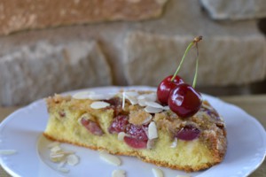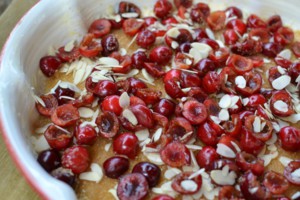 Připravenou formu si vymažte máslem, hlavně boky. Potom do ní na dno nalijte karamel. Na ten naskládejte nebo nasypte vypeckované třešně, které posypte mandlovými plátky.