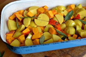 Kousky dýně přidejte do pekáčku k nakrájeným bramborám. Ochuťte solí a pepřem, přilijte olej a lístky šalvěje. Můžete malinko podlít vodou.