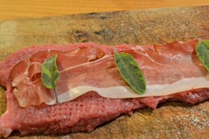 Telecí plátky si na obou stranách osolte a opepřete. Na každý plátek položte sušenou šunku a pár lístků šalvěje.
