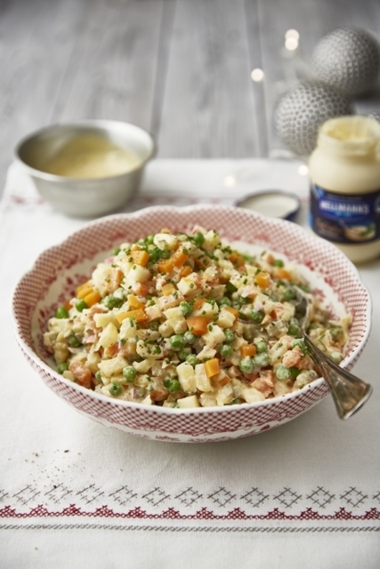Uvařené brambory a mrkev nakrájíme na kostky. Okurku, jablka na menší kostky, cibuli najemno. Vše spolu s hráškem vložíme do mísy a promícháme. Z majonézy Hellmann’s Delikátní, soli, pepře, octa, cukru připravíme dresink a smícháme se zeleninou. Případně dochutíme solí, octem, cukrem. Necháme odležet a před podáváním posypeme nasekanou pažitkou.