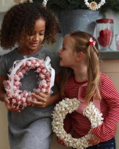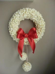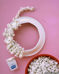 Vyrobit ho můžete několika způsoby. Nám se zalíbil nápad z webu Marthy Stewart. Jednotlivé kousky popcornu budete napichovat na jehlu a navlékat na nit. Výsledný řetěz omotáte kolem polystyrenového základu na věnec. Nakonec ozdobíte mašlí.
