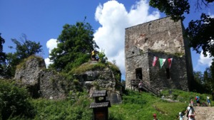 Jízda po rovince brzy končí a čeká nás výšlap ke zřícenině 6,5 km táhlé stoupání a to místy docela prudké. V tomto terénu teprve řádně oceňuji výhody, které elektrokolo nabízí. V začátku stoupání jsem samozřejmě chlapák a rozhodnu se dát si trochu do těla, intenzitu elektromotoru tedy ponechávám na úrovni Eco a pouze přehazuji normální přehazovačku na lehčí převody. Ale co se to kruci děje? Nohy začínají šlapat ztěžka a elektropohon najednou nepomáhá… Manželka (chytrá to žena) tyto ambice nemá a najednou mi během chvilky o desítky metrů ujíždí… Tudy cesta tedy nevede…