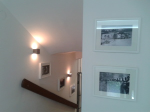 Prvek velkého fotoplátna s novodobou fotografii obce. Tento obraz pomohl opticky zvětšit malý prostor chodby a osvětlení skryté v rámu plátna umožňuje stálé osvětlení tmavého prostoru.
